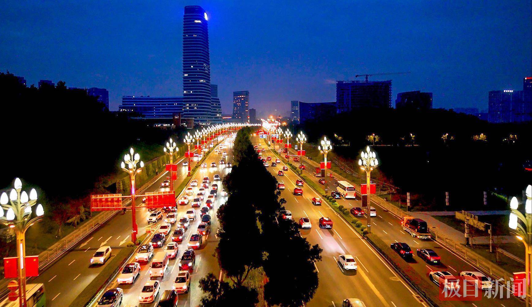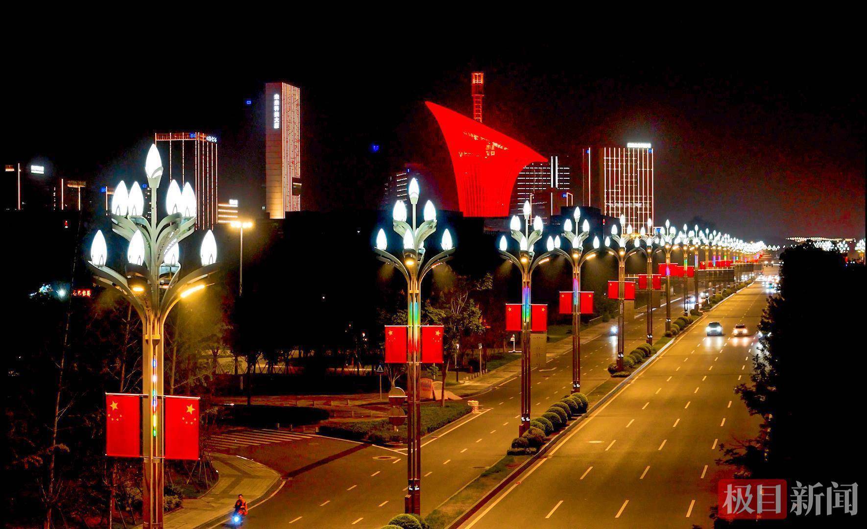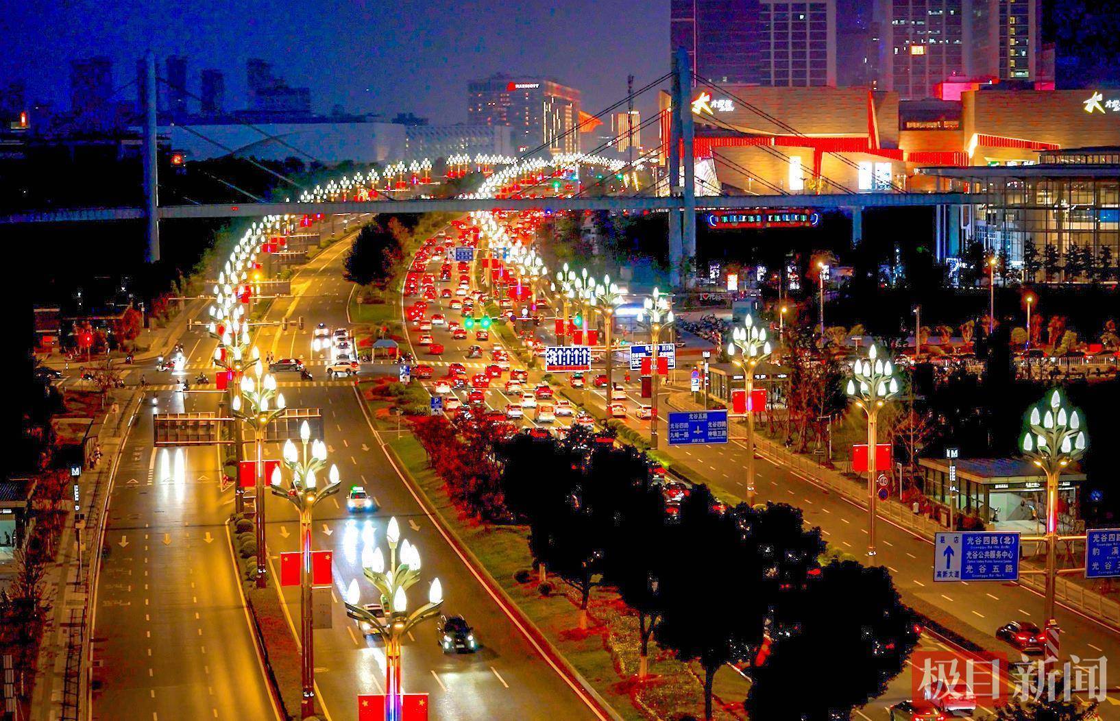 夜幕降临,节日氛围更显浓厚。光谷空轨、“马蹄莲” 等标志性建筑沿线,“中国红”与智慧路灯的“光谷金”交相辉映,光影流转间流光溢彩。这抹温暖的红色,不仅扮靓了城市夜景,更照亮了英雄城市的烟火气,传递出光谷儿女对祖国的深情祝福。