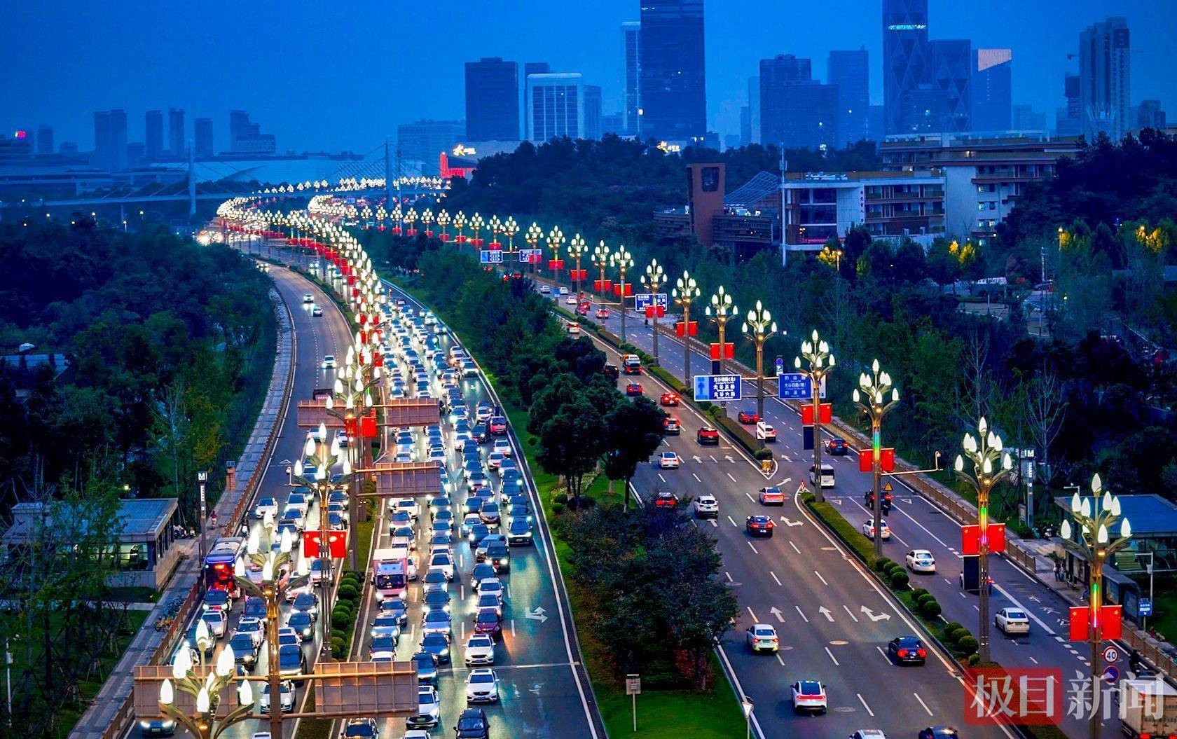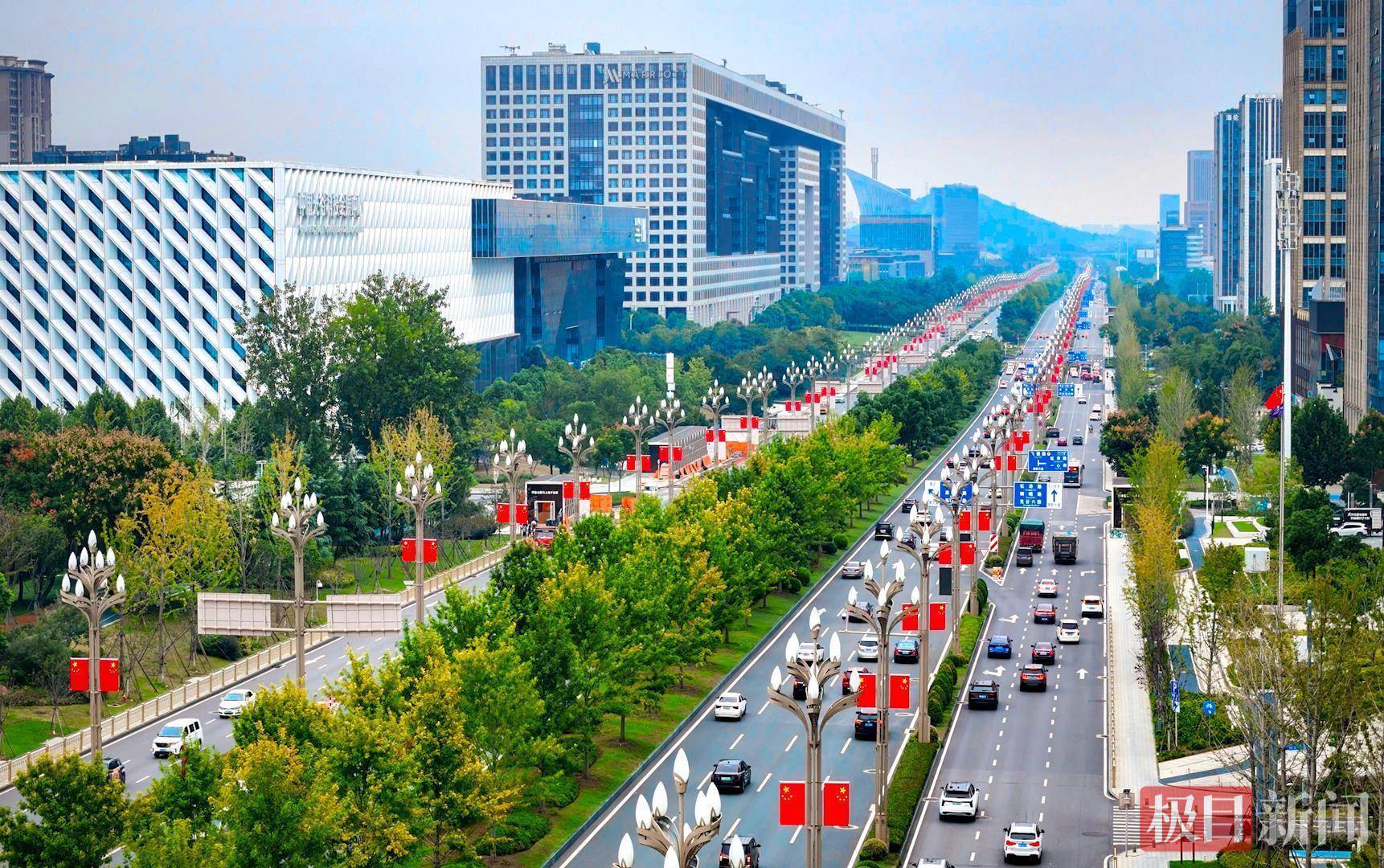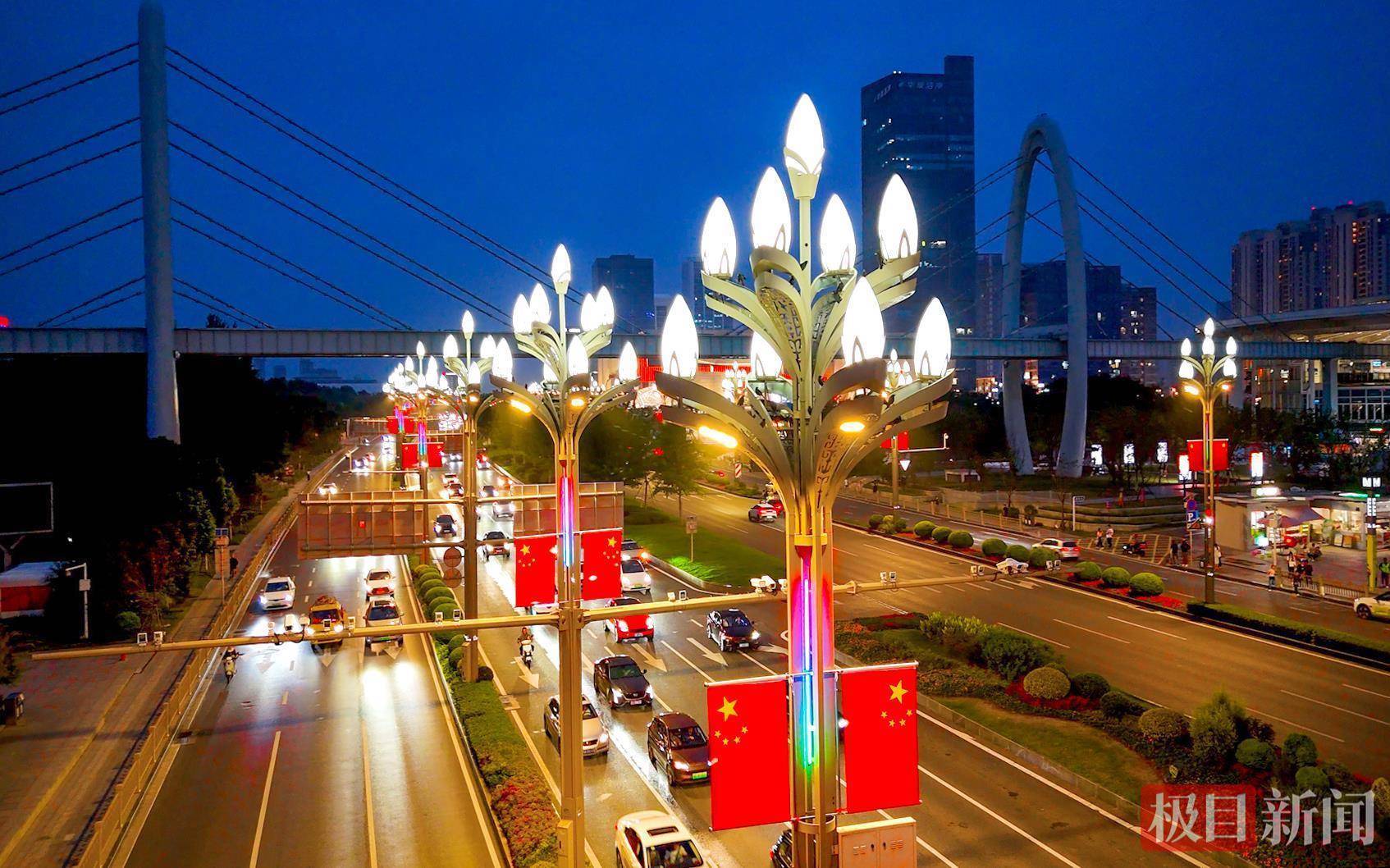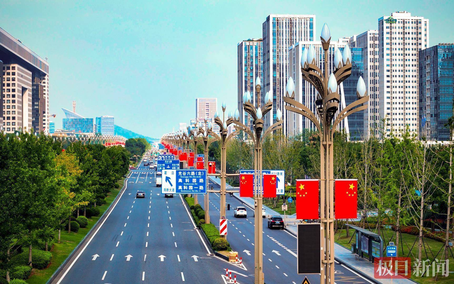 “有一种颜色叫‘中国红’,有一种信仰叫‘五星红旗’。”9月29日,武汉光谷高新大道上,智慧多功能灯杆悬挂的五星红旗迎风招展,鲜红底色与道路景致相映,提前将国庆氛围拉满。