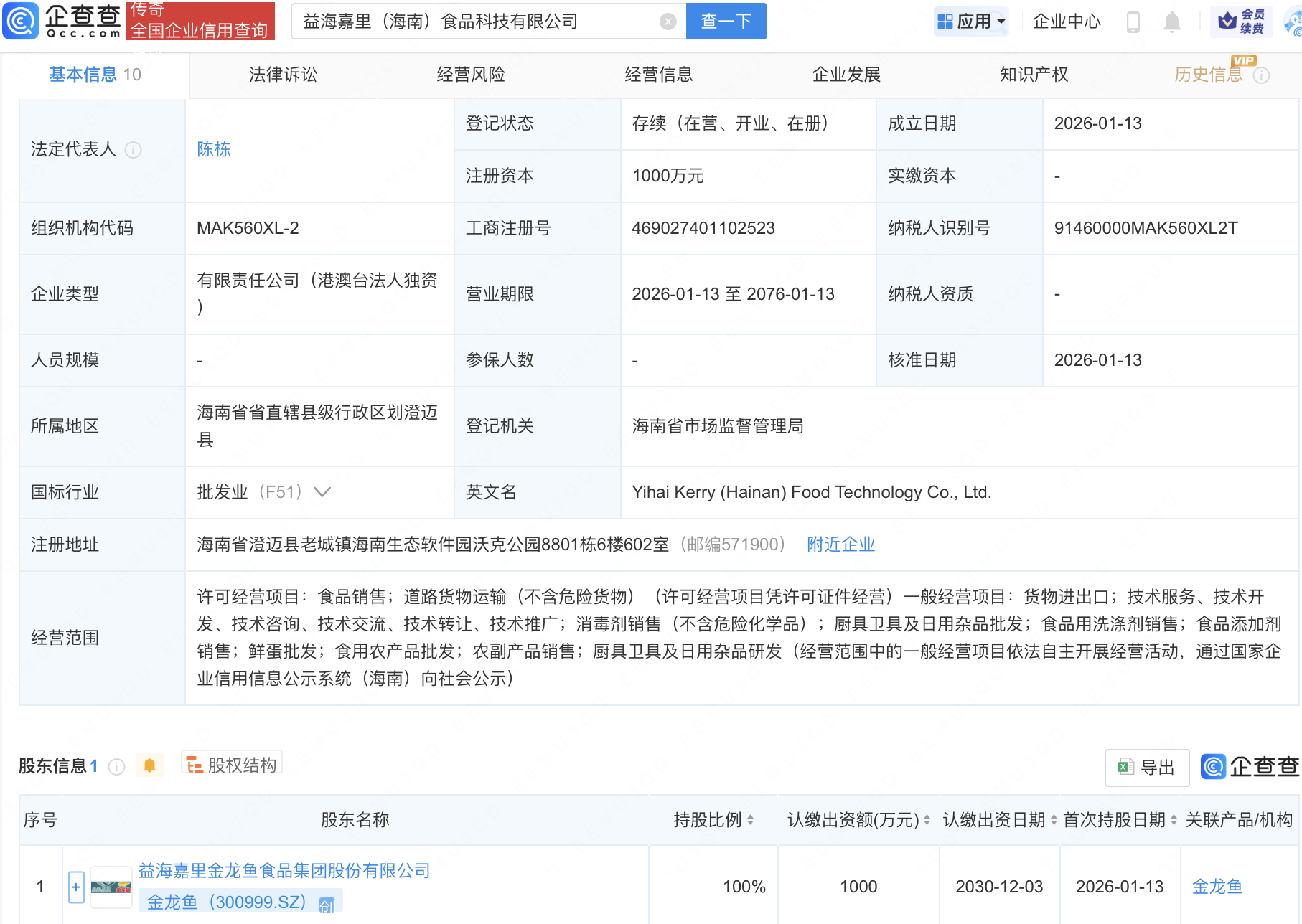 近日,益海嘉里(海南)食品科技有限公司成立,注册资本1000万元,经营范围包含:食品用洗涤剂销售;食品添加剂销售;鲜蛋批发;食用农产品批发等。企查查股权穿透显示,该公司由金龙鱼(300999)全资持股。